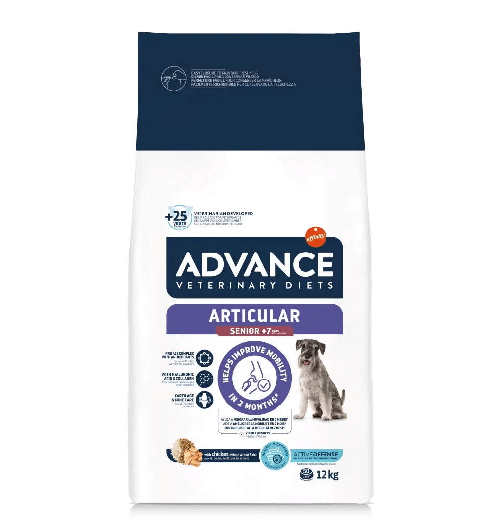 ADVANCE VETERINARY DIETS Articular Senior es un alimento completo y equilibrado, formulado para la recuperación y el apoyo nutricional en el cuidado de las articulaciones en perros senior a partir de 6 años según tamaño (maxi +6 años, medium +7 años, mini +8 años).